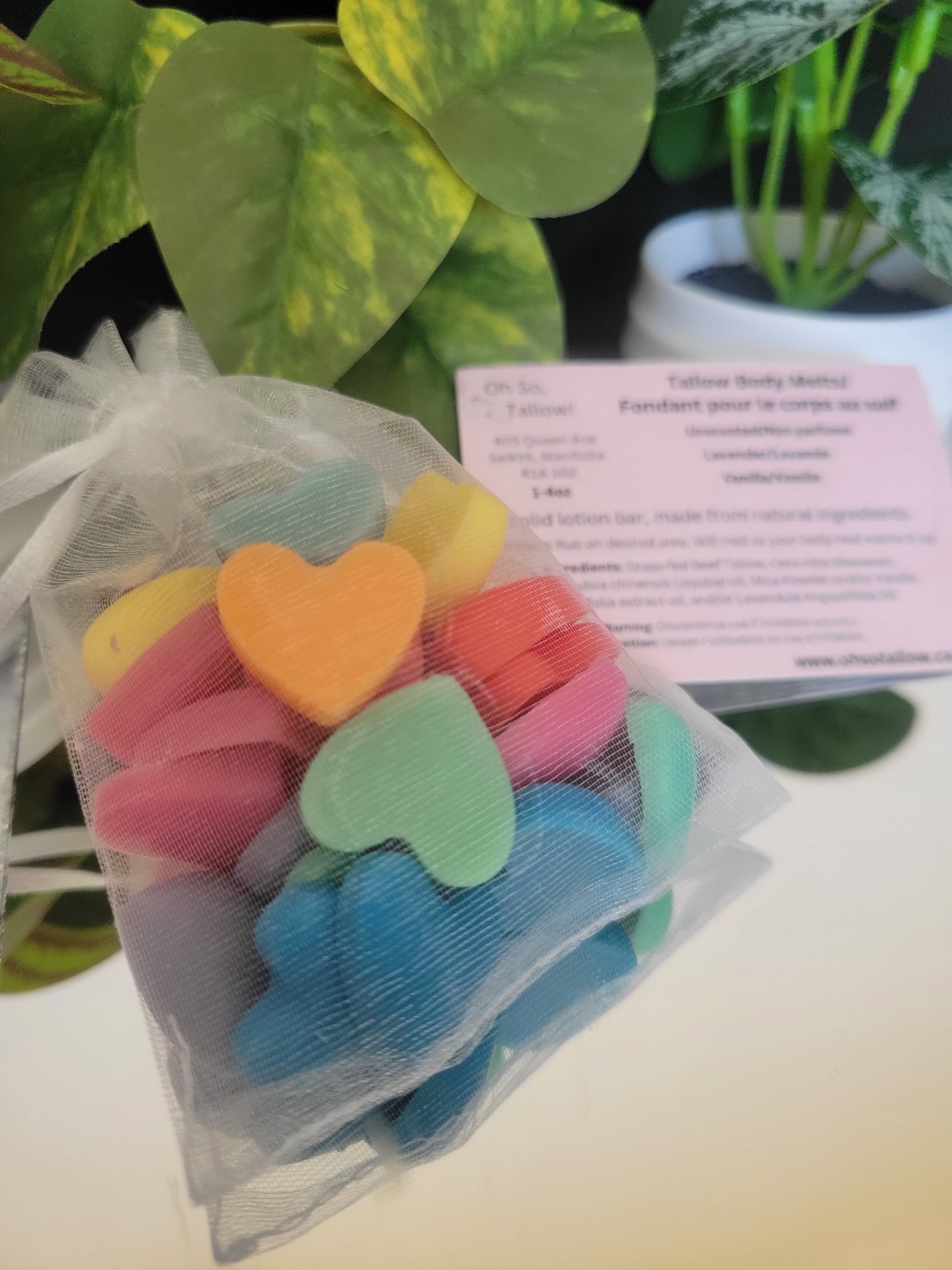 Small colorful hearts for 1 - 2-time use. Great for your hands! A mix of all scents. 30 pieces in total. All natural ingredients used. Rub between hands, your body heat will warm the melt.